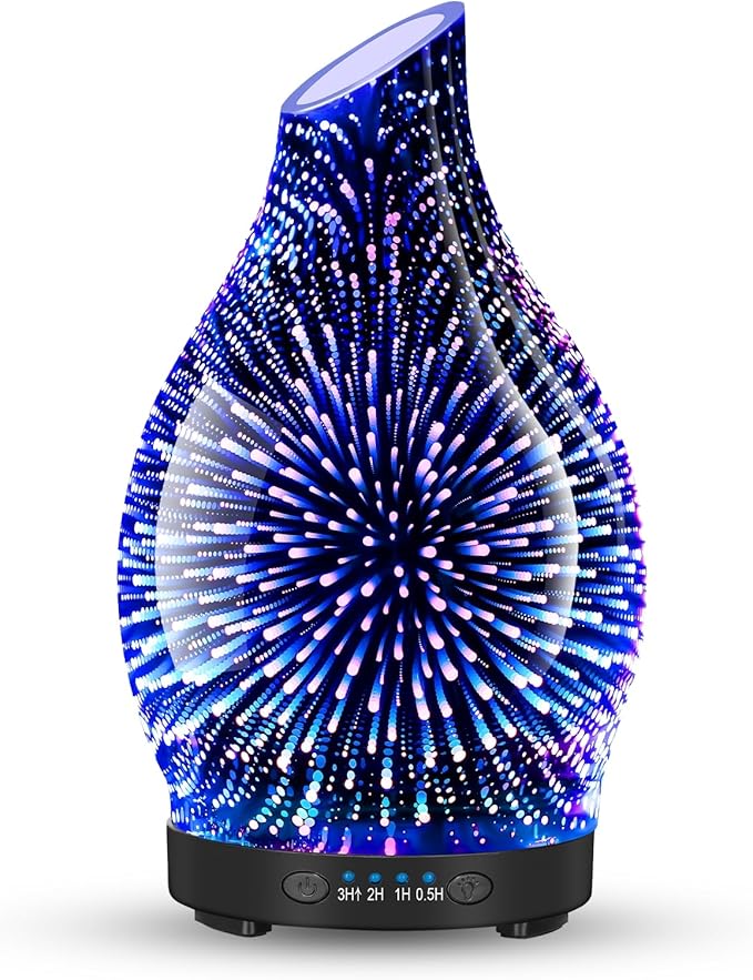 120ML Essential Oil Diffuser, 3D Glass Aromatherapy Diffuser with Auto Shut-Off and 7 Color LED Lights, Ultrasonic Mist Humidifier with 4 Timer for Home Office Bedroom (3D Fireworks)