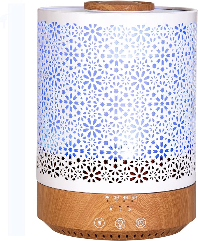 High mist output large humidifier made with premium quality materials: Besides its uses in aromatherapy, this essential oil diffuser also functions as a humidifier. Use it to improve your home’s air and atmosphere quality, cover the smell of pets or smoking, and protect you family from excessively dry air, microorganisms, allergens, dust, and more!